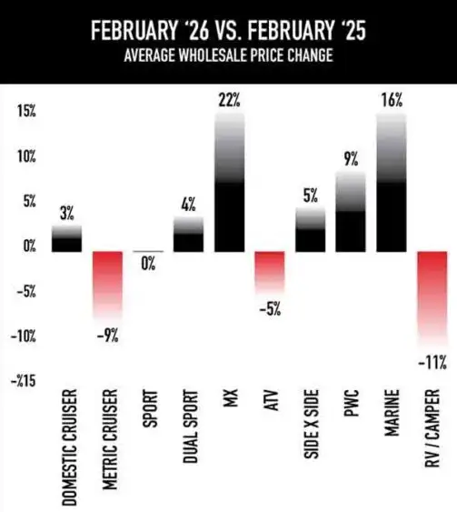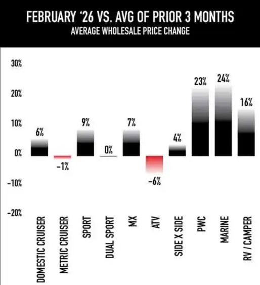 Overall, February’s pricing metrics confirm that wholesale values are firming sequentially as dealers prepare inventory for the spring riding season.