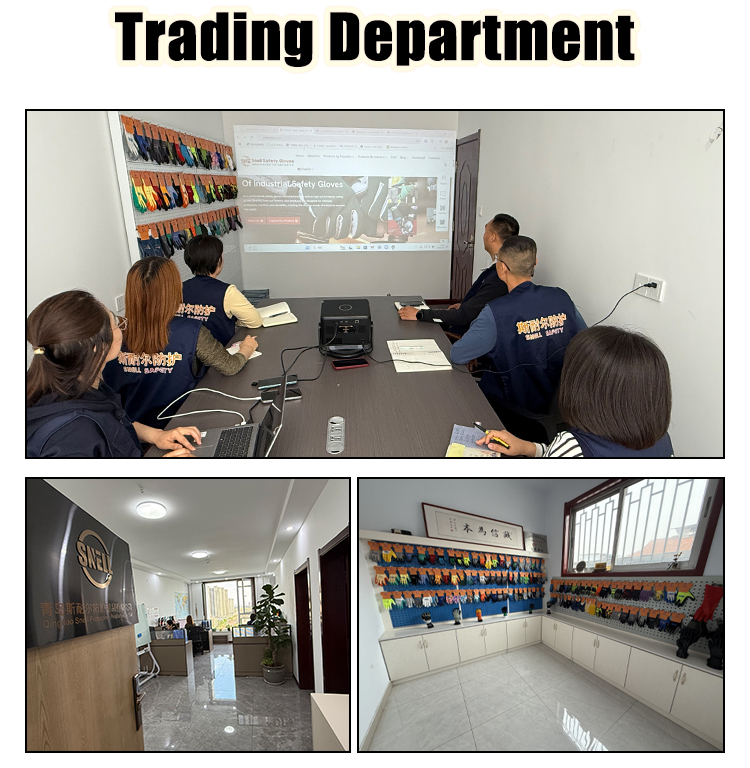 Qingdao Snell Protective Products Co.,Ltd. mainly focus on the manufacture and trading of safety gloves, the main gloves including latex coating, nitrile coating, pu coating and cut resistant work gloves, anti impact protective gloves. The self owned factory is about 30 years experience on safety gloves production, with more than 100 partners, export to EU, Asia, South America,Russia and Mid East. The capacity is 120 thousand pairs per day, which is helpful for the customers urgent orders delivery, with flexibel MOQ, some hot sale gloves leadtime is 10-20 days only,and with factory direct price to get more margin for all of you. SNELL brand is registered, we have store on alibaba, warmly welcome to talk more and visit factory.