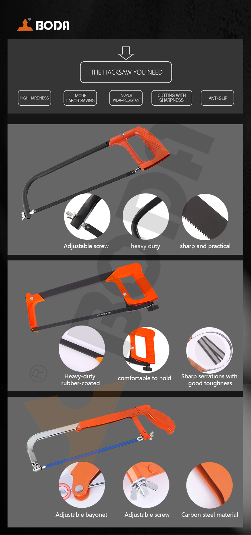 This hacksaw features a high-strength alloy frame and high-carbon steel teeth. The sharp and wear-resistant teeth ensure smooth and efficient cutting, while the non-slip handle enhances operation stability. Suitable for cutting various materials such as metal and wood, it is widely used in hardware maintenance, pipe processing and handcrafting. With portability and durability, it is a practical manual cutting tool.