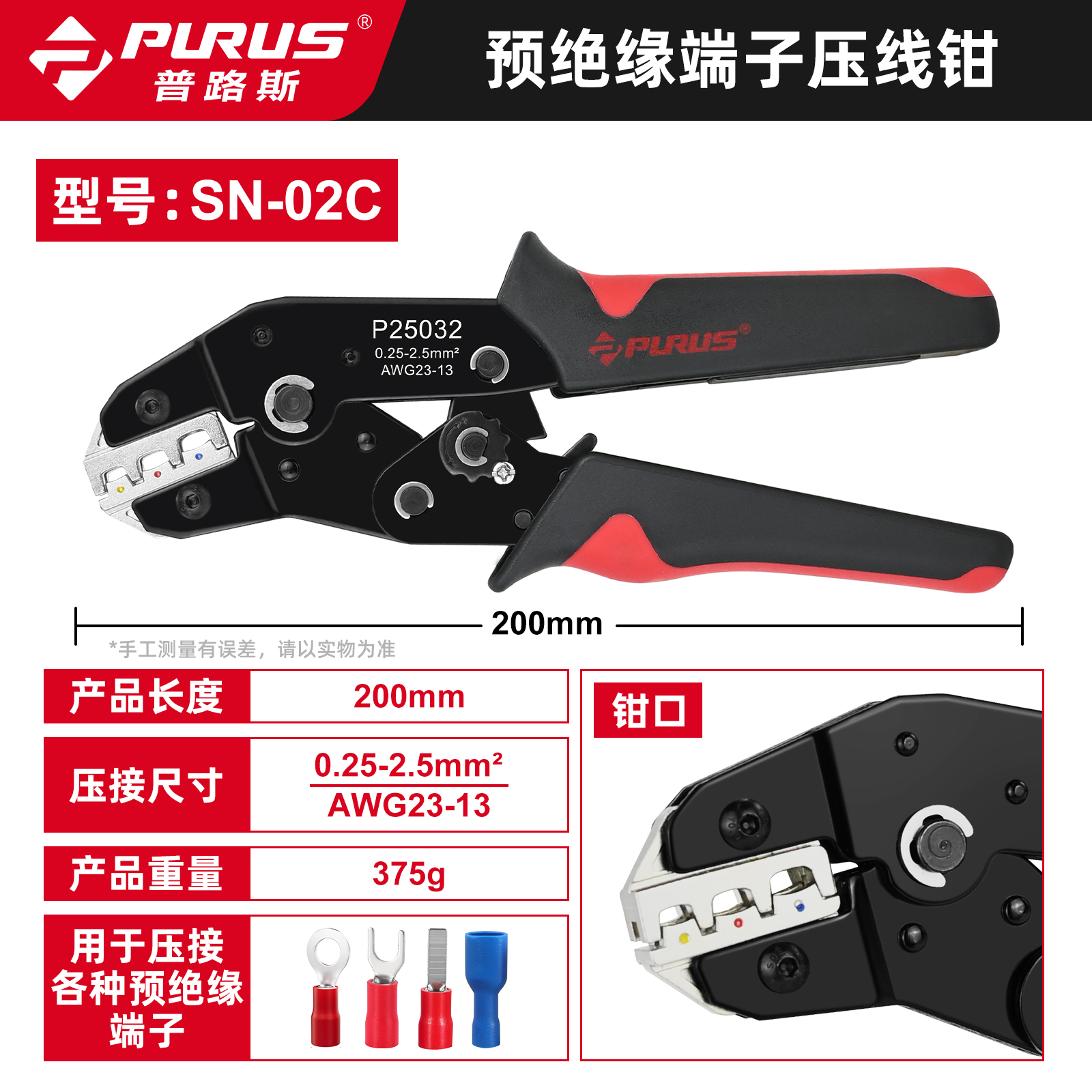 Crimping insulated nylon connectors and electrical wire connectors Adjustable ratchet and lever action constructionreduces fatigue degree. Crimping range: 0.25-2.5mm²/AWG23-13 Quick release safety lock