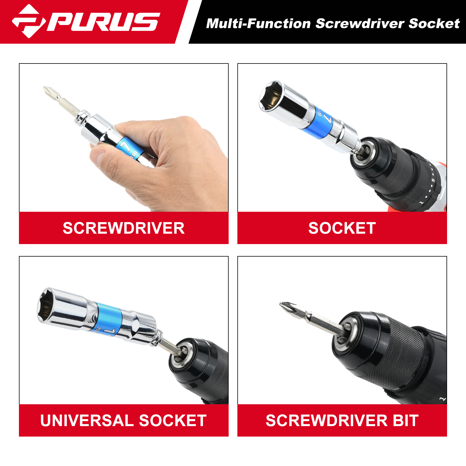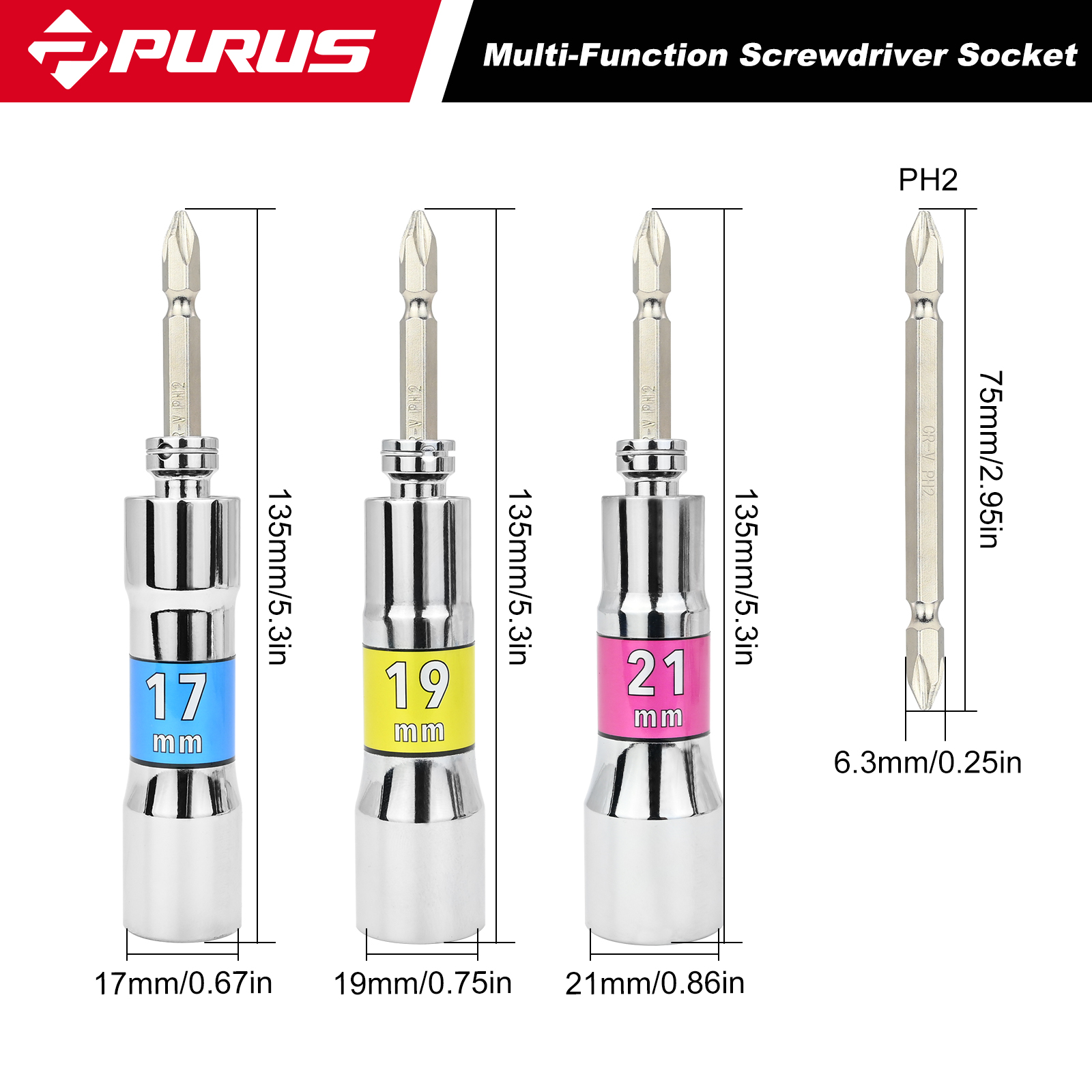 CR-V drop forged By attaching a socket until its end stop is reached, the wobble extension may also be used as a rigid connection Multifunctional: screwdriver, socket, universal socket, screwdriver bit 2-component soft foam insert 7PCS:17/19/21mm, PH2*4