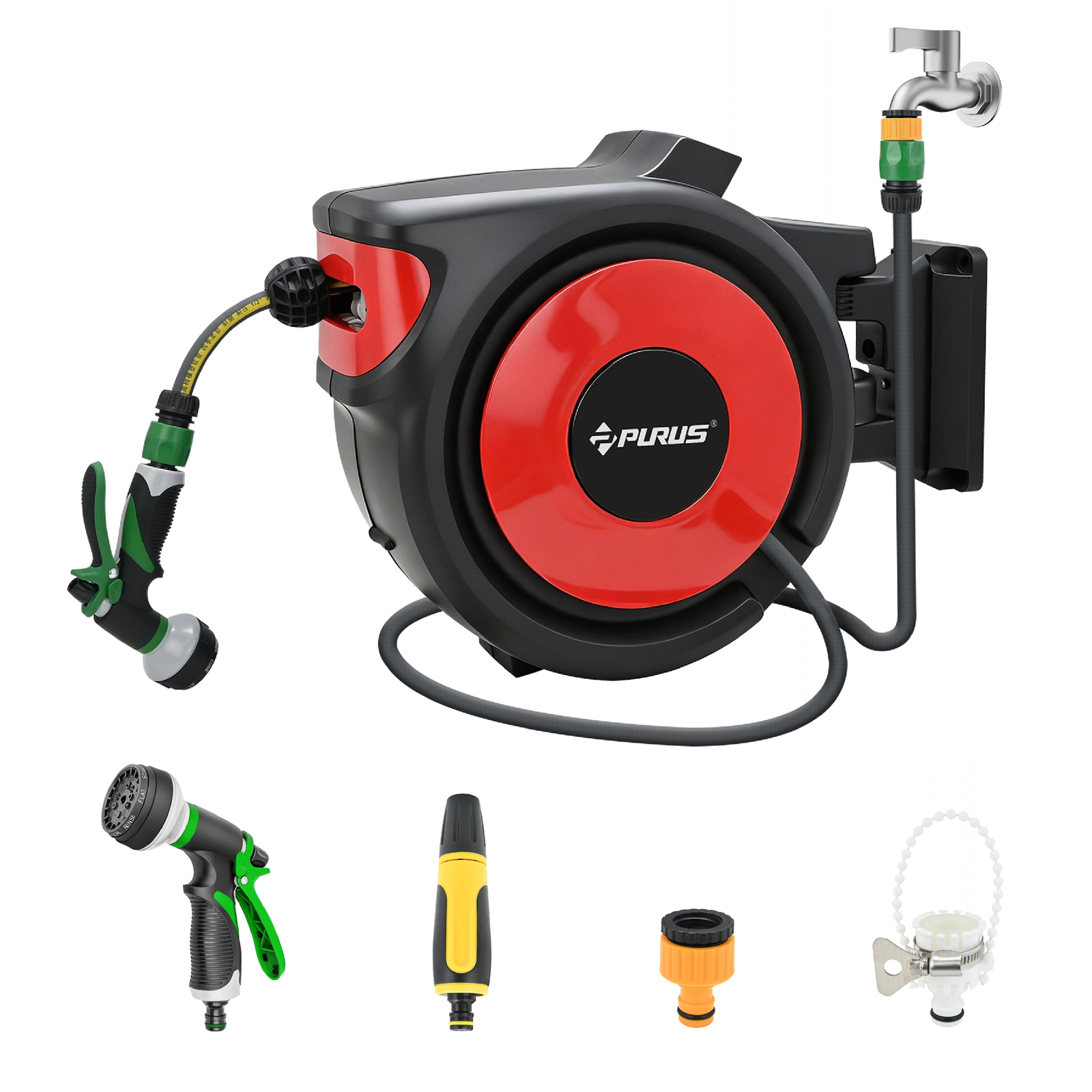 Hose stop at any point with "Stop at any point" function Neat winding of the hose thanks to automatic guidance Braked winding to prevent risk of accidents Suitable for car washing and watering Multi-layer braided hose Hose Specifications: 12x16mm Hose length: 13m/30m Length of connection hose: 2m Working pressure: 8Bar High-quality ABS plastic housing Portable adjustable sliding buckle design Comes with a 180° swivel bracket Connection inlet: 1/2" ISO5774 :2016/TYPE B