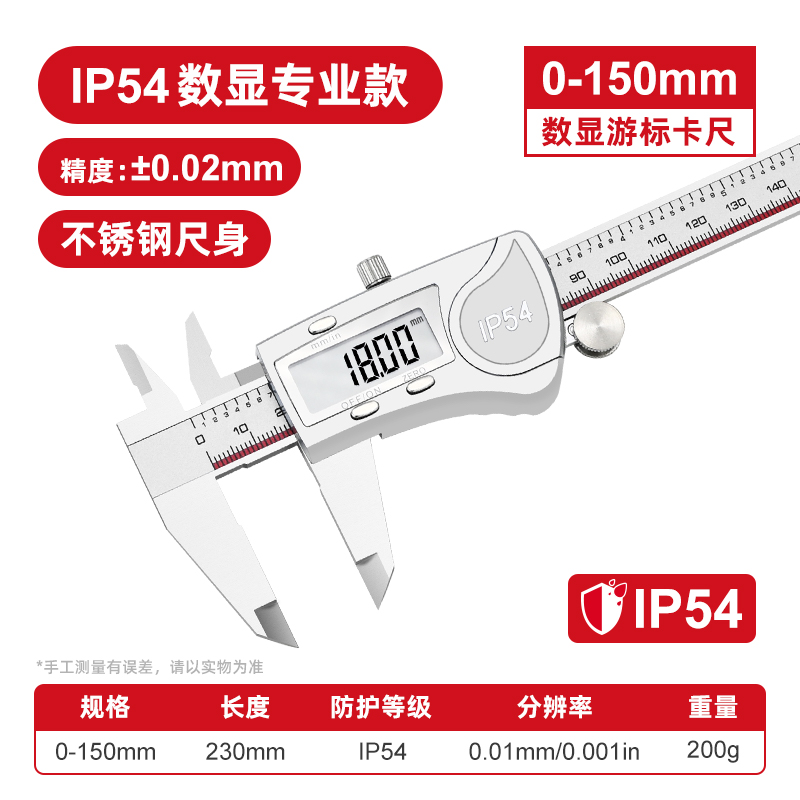 LCD digital, accuracy:±0.02mm/0.001" IP54 dustproof and splash-proof Measuring range up to 150 mm With depth gauge Reversible from mm to inch Nonius 0.01 mm and 0.001" On/off switch Battery included With fixing screw Made of stainless steel Plastic box DIN 862