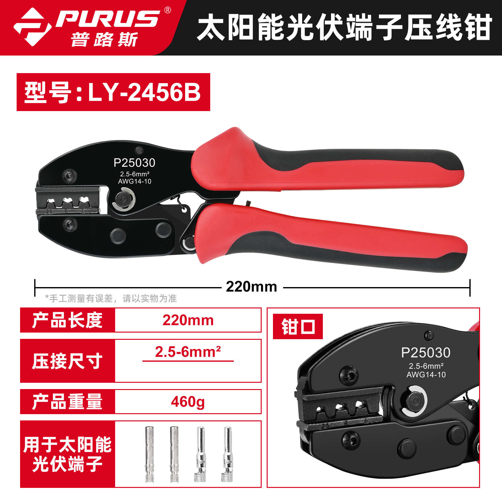 用途:压接MC4光伏太阳能端子 省力棘轮设计,操作轻松、压接效果好 压接范围广泛可压接2.5-6mm²端子