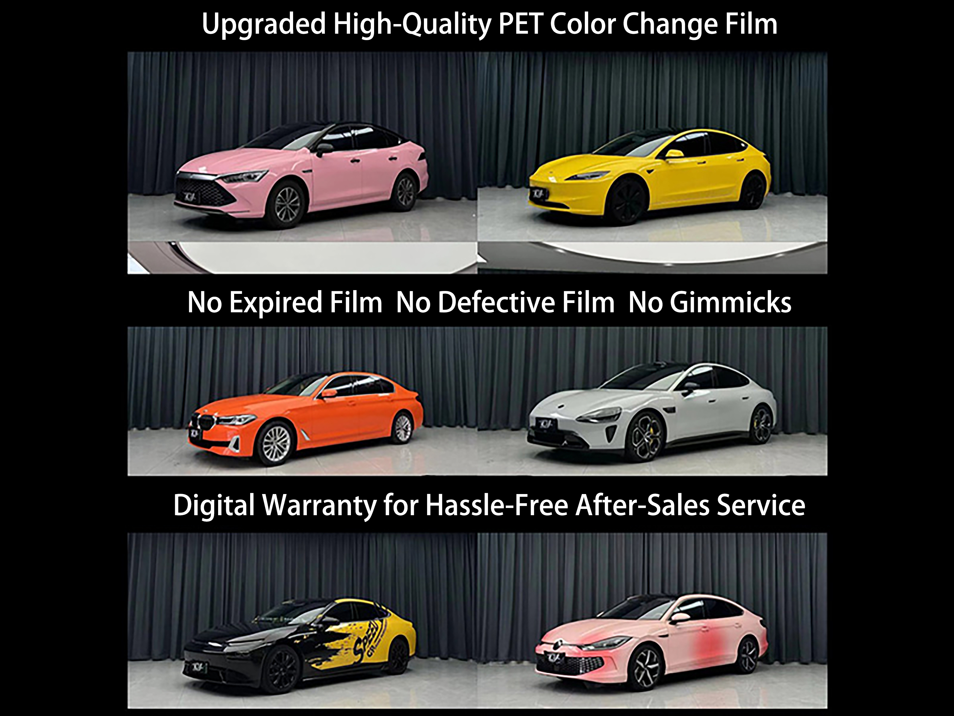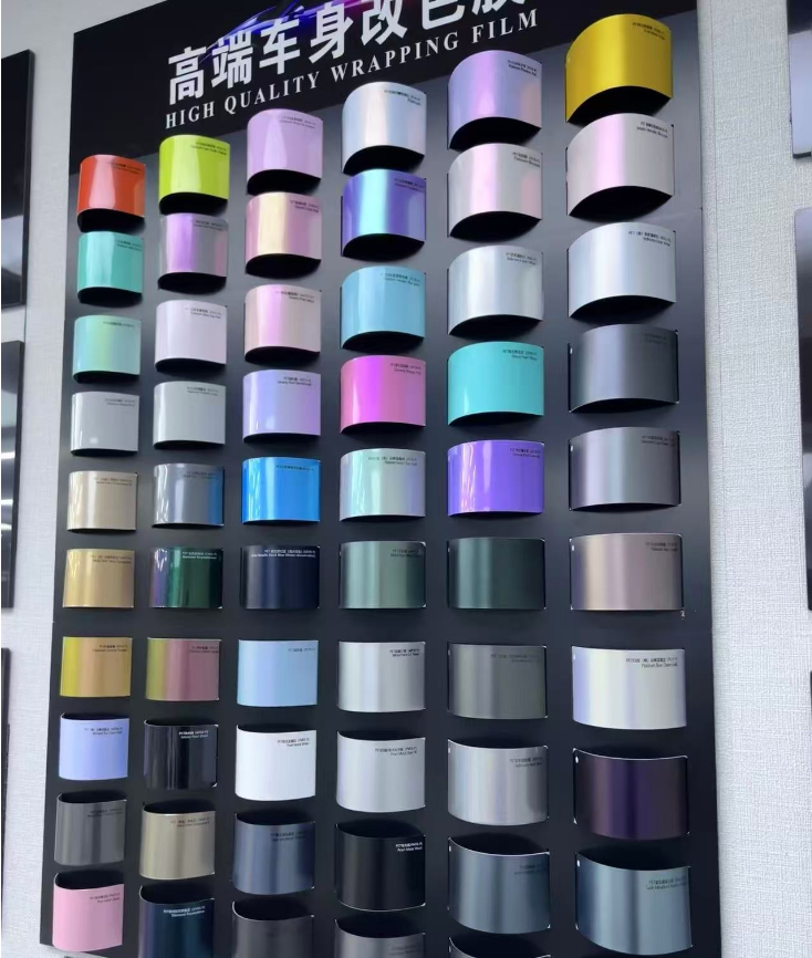 我司的改色膜采用的是: 1:PET膜系列:是目前高端改色膜的材质,质感高能药效减少“橘皮纹”,贴合度高,撕膜时不易伤车漆, 焕彩不伤漆,改色更随心,千色可选,个性由我,保护原厂漆,改色无负担。 2:TPU膜系列:是改色膜界顶级材质,是改色膜,更是隐形车衣,焕新色彩,无惧划痕,色彩随心,防护随行,划痕自修复,亮丽更持久兼具PET的没关和隐形车衣的超强防护性。
