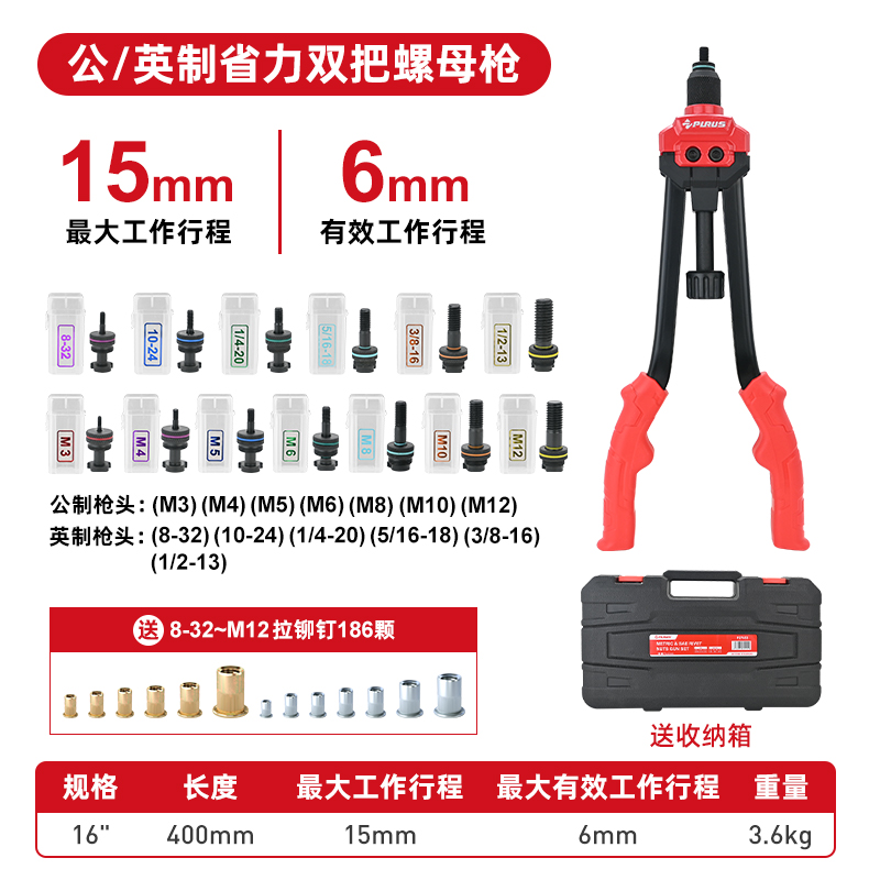公/英制枪头 省力杠杆设计,拉铆更轻松 无需工具可手动更换拉铆枪头 舒适的TPR手柄 塑盒包装
